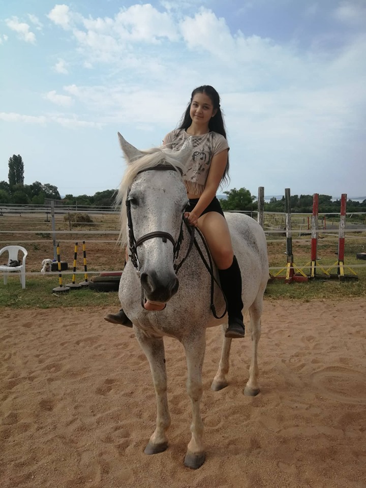 Amikor nem tanulok, vagy karatézom, akkor szívesen töltöm az időt a lovardában. A kedvenc lovamat Durcásnak hívják, általában vele száguldok erdőn- mezőn át, vagy a gyakorlópályán. Igazi egyéniség, így közel áll a szívemhez. Azt hiszem, sok közös van bennünk, így az összhang is hamar kialakult közöttünk. Legfőképpen száguldani szeretünk a szelek szárnyán, amitől az oktatómnak néha konkrétan az összes haja szála égnek áll.