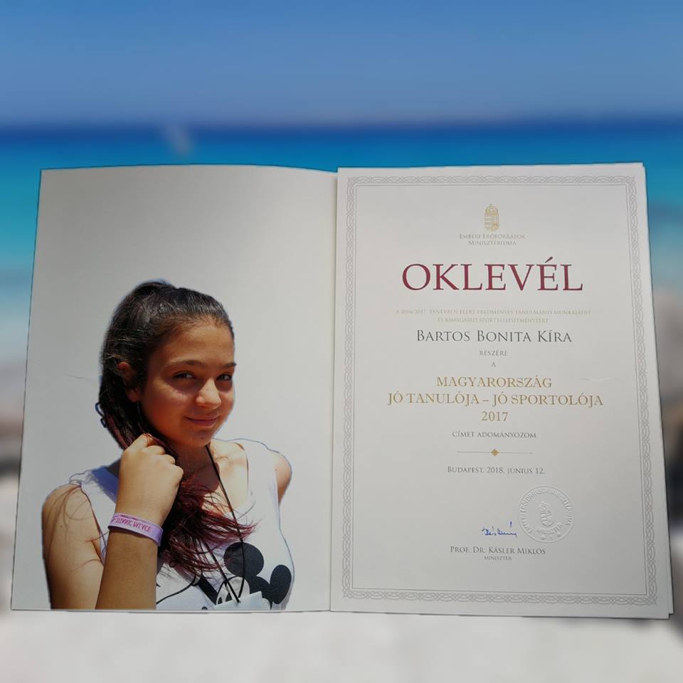 Miniszter úr nevében ezúton gratulálok a 2016/2017-es tanévben elért kimagasló tanulmányi és sportteljesítményéhez, amelynek elismeréseként mellékelten küldöm a "Magyarország jó tanulója - jó sportolója 2017" címet elismerő minisztériumi oklevelet. További tanulmányaihoz és sporttevékenységéhez sok sikert, a nyári szünetre pedig tartalmas kikapcsolódást és jó pihenést kívánok!